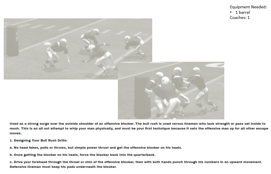 Bull Rush Drill Defense DrillsDefense Lineman DrillsFundamentals6-point explosionMan take-off DrillBasic DefenseSwim MoveRip MoveRip Swim Crossover SpinBull Rush DrillQB Sack DrillTacklingFront TackleAngle Tackle DrillAngle Tackle w/2 DummiesScore Tackling Drill v2Block Destruction DrillFootworkSeat Roll DrillFumble RecoveryWave DrillAngle Pursuit