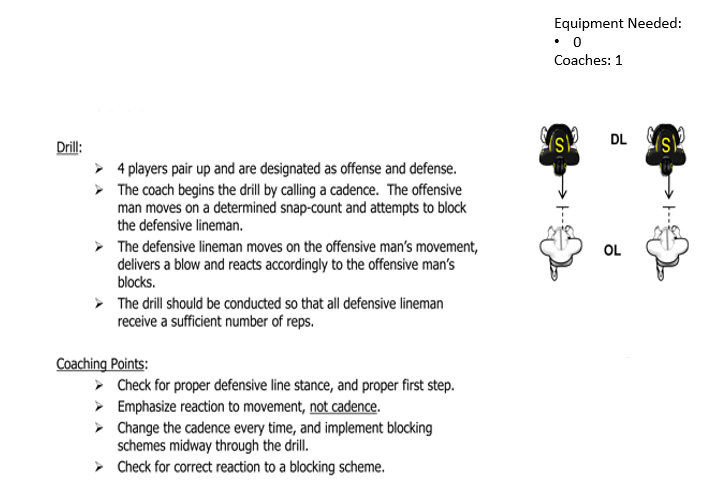 Man take-off Drill Defense DrillsDefense Lineman DrillsFundamentals6-point explosionMan take-off DrillBasic DefenseSwim MoveRip MoveRip Swim Crossover SpinBull Rush DrillQB Sack DrillTacklingFront TackleAngle Tackle DrillAngle Tackle w/2 DummiesScore Tackling Drill v2Block Destruction DrillFootworkSeat Roll DrillFumble RecoveryWave DrillAngle Pursuit