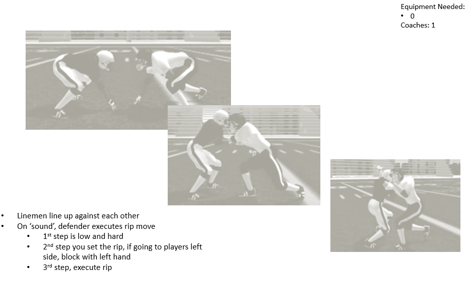 Rip Move Defense DrillsDefense Lineman DrillsFundamentals6-point explosionMan take-off DrillBasic DefenseSwim MoveRip MoveRip Swim Crossover SpinBull Rush DrillQB Sack DrillTacklingFront TackleAngle Tackle DrillAngle Tackle w/2 DummiesScore Tackling Drill v2Block Destruction DrillFootworkSeat Roll DrillFumble RecoveryWave DrillAngle Pursuit