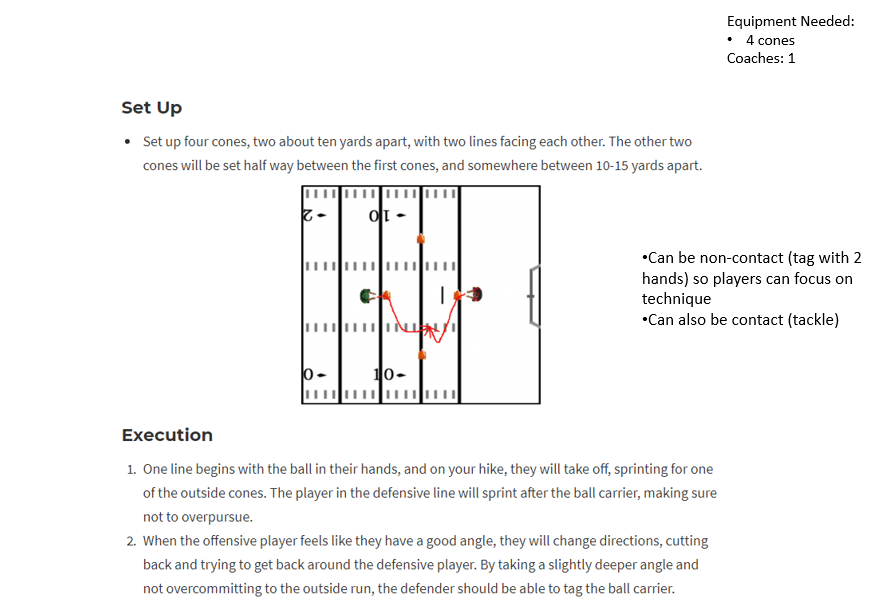 Cutback Drill Defense DrillsDefensive Back DrillsFundamentalsBreakdown PositionSwoop/Breakdown ProgressionSwoop/Breakdown – Coffin BagsBasic DefenseStay with the Receiver DrillDB Zone BreakCushion DrillMirror DrillStalk DrillTacklingOpen Field TacklingCutback Drill45 Degree Tackle DrillGet up TacklingRun & GatherFootwork/ReactionCone Plant Reaction DrillFumble Recovery DrillWave DrillBall Angle DrillAngle Pursuit DrillTip DrillAttack the BallOff the LoopPedal Break 90Super Buzz DrillFlip Your HipsFlip Your Hips 36045 Back-Pedal 45