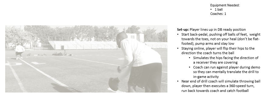 Flip Your Hips 360 – DB Defense DrillsDefensive Back DrillsFundamentalsBreakdown PositionSwoop/Breakdown ProgressionSwoop/Breakdown – Coffin BagsBasic DefenseStay with the Receiver DrillDB Zone BreakCushion DrillMirror DrillStalk DrillTacklingOpen Field TacklingCutback Drill45 Degree Tackle DrillGet up TacklingRun & GatherFootwork/ReactionCone Plant Reaction DrillFumble Recovery DrillWave DrillBall Angle DrillAngle Pursuit DrillTip DrillAttack the BallOff the LoopPedal Break 90Super Buzz DrillFlip Your HipsFlip Your Hips 36045 Back-Pedal 45