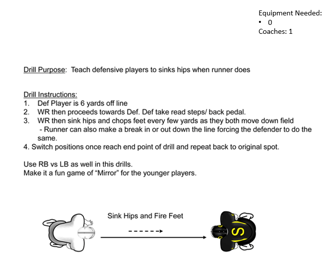 Match Hips (Mirror) Drill – DB Defense DrillsDefensive Back DrillsFundamentalsBreakdown PositionSwoop/Breakdown ProgressionSwoop/Breakdown – Coffin BagsBasic DefenseStay with the Receiver DrillDB Zone BreakCushion DrillMirror DrillStalk DrillTacklingOpen Field TacklingCutback Drill45 Degree Tackle DrillGet up TacklingRun & GatherFootwork/ReactionCone Plant Reaction DrillFumble Recovery DrillWave DrillBall Angle DrillAngle Pursuit DrillTip DrillAttack the BallOff the LoopPedal Break 90Super Buzz DrillFlip Your HipsFlip Your Hips 36045 Back-Pedal 45