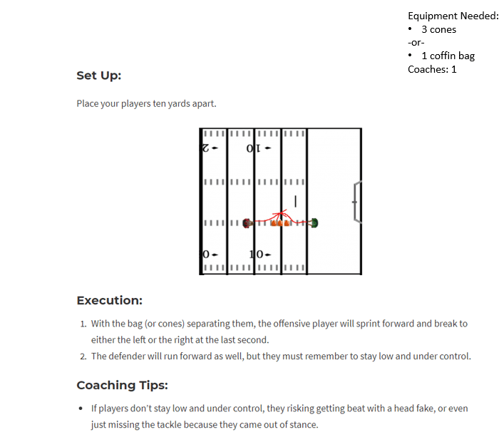 Open Field Tackling Defense DrillsDefensive Back DrillsFundamentalsBreakdown PositionSwoop/Breakdown ProgressionSwoop/Breakdown – Coffin BagsBasic DefenseStay with the Receiver DrillDB Zone BreakCushion DrillMirror DrillStalk DrillTacklingOpen Field TacklingCutback Drill45 Degree Tackle DrillGet up TacklingRun & GatherFootwork/ReactionCone Plant Reaction DrillFumble Recovery DrillWave DrillBall Angle DrillAngle Pursuit DrillTip DrillAttack the BallOff the LoopPedal Break 90Super Buzz DrillFlip Your HipsFlip Your Hips 36045 Back-Pedal 45