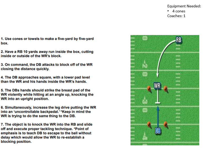 Stalk Drill – DB Defense DrillsDefensive Back DrillsFundamentalsBreakdown PositionSwoop/Breakdown ProgressionSwoop/Breakdown – Coffin BagsBasic DefenseStay with the Receiver DrillDB Zone BreakCushion DrillMirror DrillStalk DrillTacklingOpen Field TacklingCutback Drill45 Degree Tackle DrillGet up TacklingRun & GatherFootwork/ReactionCone Plant Reaction DrillFumble Recovery DrillWave DrillBall Angle DrillAngle Pursuit DrillTip DrillAttack the BallOff the LoopPedal Break 90Super Buzz DrillFlip Your HipsFlip Your Hips 36045 Back-Pedal 45