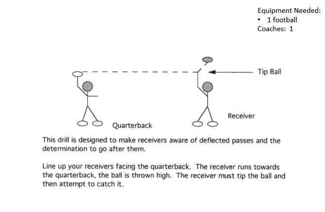 Tip Drill – DB Defense DrillsDefensive Back DrillsFundamentalsBreakdown PositionSwoop/Breakdown ProgressionSwoop/Breakdown – Coffin BagsBasic DefenseStay with the Receiver DrillDB Zone BreakCushion DrillMirror DrillStalk DrillTacklingOpen Field TacklingCutback Drill45 Degree Tackle DrillGet up TacklingRun & GatherFootwork/ReactionCone Plant Reaction DrillFumble Recovery DrillWave DrillBall Angle DrillAngle Pursuit DrillTip DrillAttack the BallOff the LoopPedal Break 90Super Buzz DrillFlip Your HipsFlip Your Hips 36045 Back-Pedal 45