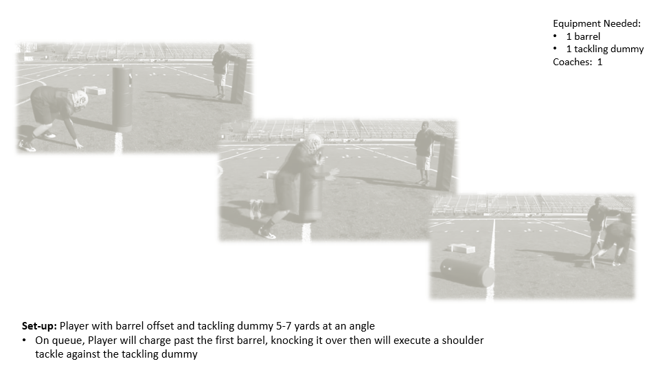 Angle Tackle w/2 Dummies – DE YouTube Video – go to 2:29 Defense DrillsDefensive End DrillsFundamentalsDefensive End Stance & Start6-point explosion DrillBasic DefenseRip MoveSwim MoveDefensive End Crash DrillSpot, Contain, and PursueTacklingMachine GunShed Block & ContainBlock DestructionAngle PursuitAngle Tackle w/2 Dummies