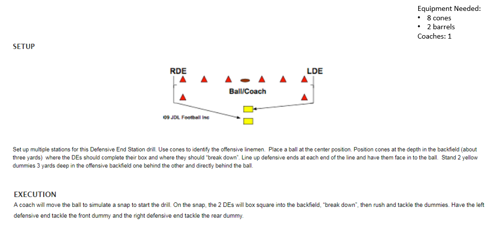 Defensive End Crash Drill Defense DrillsDefensive End DrillsFundamentalsDefensive End Stance & Start6-point explosion DrillBasic DefenseRip MoveSwim MoveDefensive End Crash DrillSpot, Contain, and PursueTacklingMachine GunShed Block & ContainBlock DestructionAngle PursuitAngle Tackle w/2 Dummies