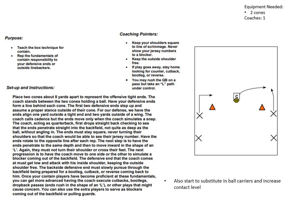 Spot, Contain, and Pursue Drill Defense DrillsDefensive End DrillsFundamentalsDefensive End Stance & Start6-point explosion DrillBasic DefenseRip MoveSwim MoveDefensive End Crash DrillSpot, Contain, and PursueTacklingMachine GunShed Block & ContainBlock DestructionAngle PursuitAngle Tackle w/2 Dummies