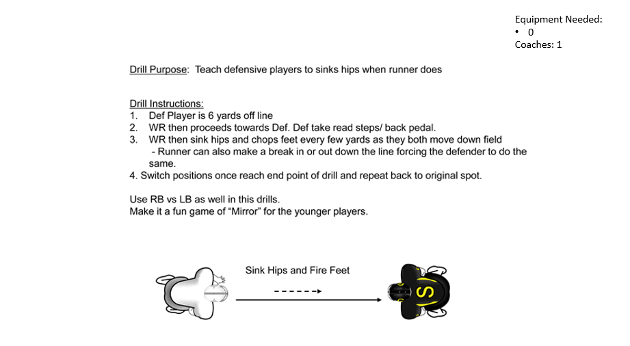 Match Hips (Mirror) Drill Defense DrillsLinebacker DrillsFundamentalsBreakdown PositionSwoop/Breakdown ProgressionTacklingShock & ShedScore Tackling Drill v1Score Tackling Drill v2Shimmy DrillBlock DestructionButt Tackle Drill3 Way Tackle DrillFootwork/ReactionForward Run &Roll DrillStep Over &Back DrillBag &cut work DrillFumble RecoveryMatch Hips (Mirror) Drill