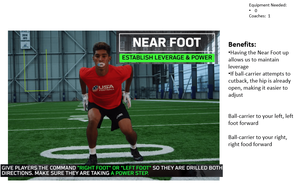 Near Foot Defense DrillsTackling DrillsFundamentalsBreakdown PositionNear FootSwoopShootUppercutsUppercuts Progression 1Uppercuts Progression 2LeverageNear Foot Near ShoulderNear Hip DrillRun & Gather2 Man Drill2 Man RabbitForm TacklingPop up TackleTight Angle TackleAngle Tackle w/BagSprint Tackle w/BagPopsicle TacklingGet up TacklingSplatter TacklingThigh & Drive/RollKneeling Drive w/BagKneeling Drive w/PlayerKneeling Drive w/padsStanding Drive w/bagStanding Drive w/playerStanding Drive w/padsTwo Step DriveRunning Drive