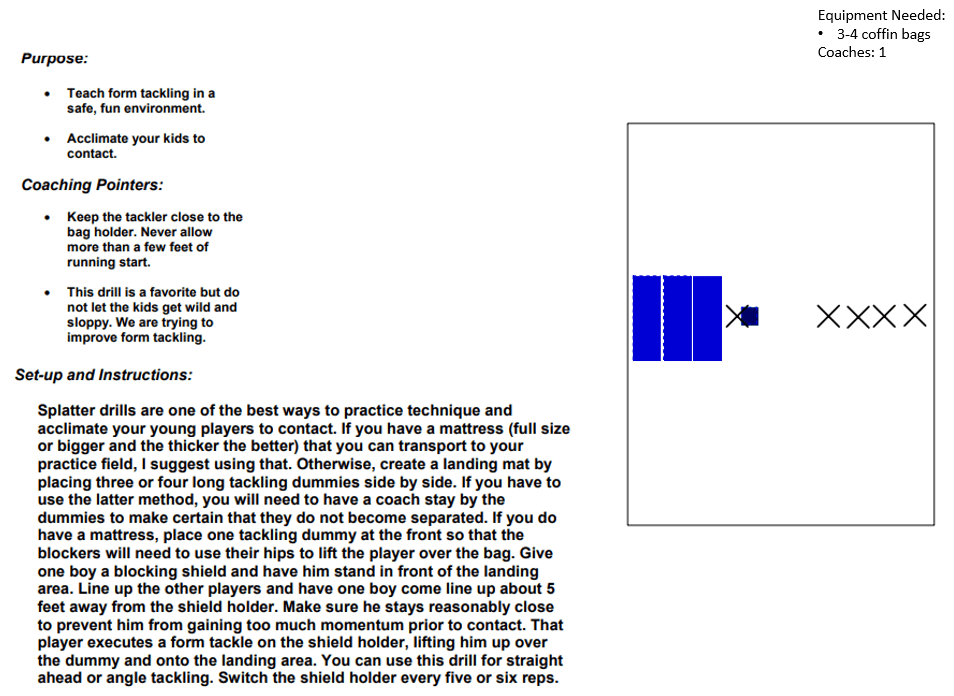 Splatter Tackling Defense DrillsTackling DrillsFundamentalsBreakdown PositionNear FootSwoopShootUppercutsUppercuts Progression 1Uppercuts Progression 2LeverageNear Foot Near ShoulderNear Hip DrillRun & Gather2 Man Drill2 Man RabbitForm TacklingPop up TackleTight Angle TackleAngle Tackle w/BagSprint Tackle w/BagPopsicle TacklingGet up TacklingSplatter TacklingThigh & Drive/RollKneeling Drive w/BagKneeling Drive w/PlayerKneeling Drive w/padsStanding Drive w/bagStanding Drive w/playerStanding Drive w/padsTwo Step DriveRunning Drive