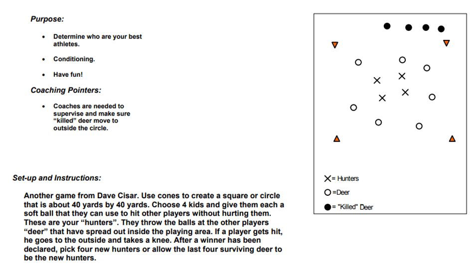 Deer Hunter (sharks/minnows) DrillsBig OK DrillTeam Big OK DrillDeer Hunter (sharks/minnows)Sumo Drill (bull in the ring)King of the HillGladiator BallGolf Football DrillSlam Dunk