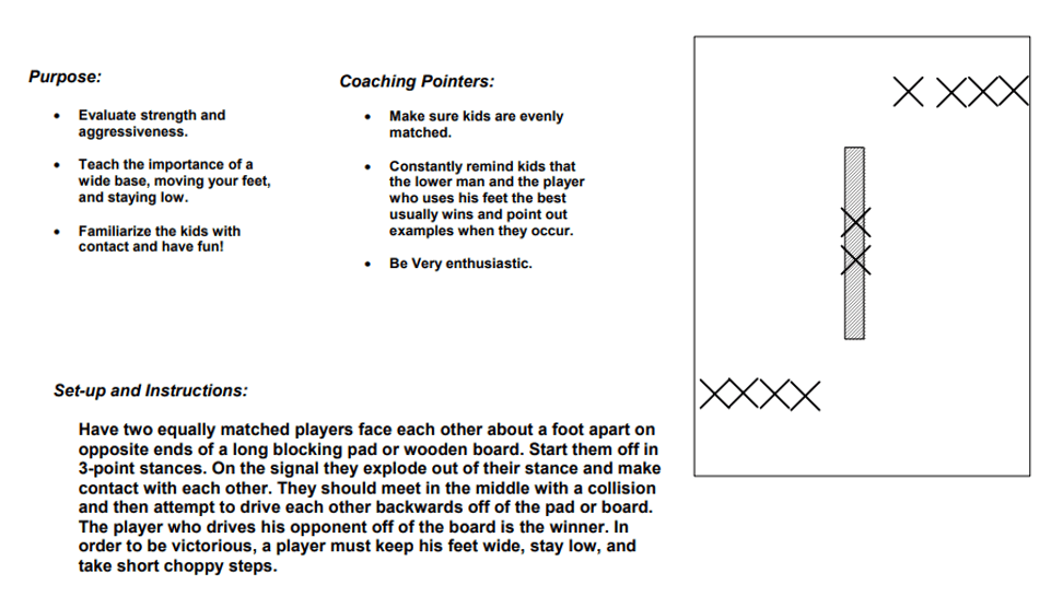 King of the Hill DrillsBig OK DrillTeam Big OK DrillDeer Hunter (sharks/minnows)Sumo Drill (bull in the ring)King of the HillGladiator BallGolf Football DrillSlam Dunk