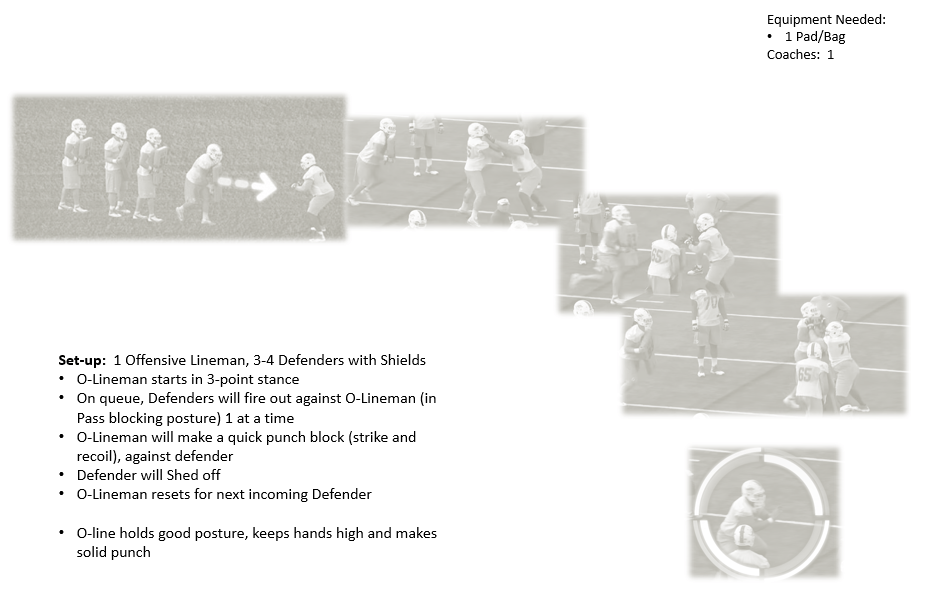 Continuous Set Offense DrillsOffense Lineman DrillsFundamentalsStance DrillStanding Broad JumpDuck WalkBird DogLow Level Pad DrillBasic BlockingRIP/LIZ Line BlockingBarrel Drill – Fit & FinishBoard DrillBlocking BattleBlock the AlleyLine to BackerRun BlockingDown Blocking DrillReach DrillDrive BlockingPass BlockingContinuous SetContinuous Set – Multiple SetsSet and PunchFinish DrillCenterUnder Center Snaps – LinemanDirect Snaps – LinemanTight-EndReach Block & Catch