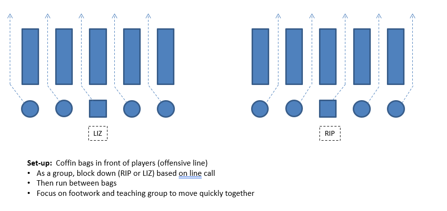RIP/LIZ Line Blocking Offense DrillsOffense Lineman DrillsFundamentalsStance DrillStanding Broad JumpDuck WalkBird DogLow Level Pad DrillBasic BlockingRIP/LIZ Line BlockingBarrel Drill – Fit & FinishBoard DrillBlocking BattleBlock the AlleyLine to BackerRun BlockingDown Blocking DrillReach DrillDrive BlockingPass BlockingContinuous SetContinuous Set – Multiple SetsSet and PunchFinish DrillCenterUnder Center Snaps – LinemanDirect Snaps – LinemanTight-EndReach Block & Catch