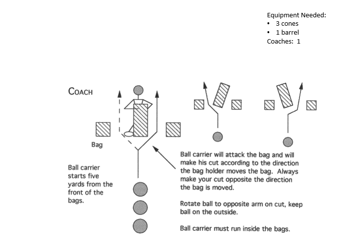 Bag Read and Cut Drill Offense DrillsRunning Back DrillsFundamentalsRunning Back HandoffRunning Back Hand Off DrillEnd Run (Pitch) DrillJet Sweep DrillBall WrestlingFootworkJump CutsPopcorn Agility DrillRB Figure 8Basic RunningStiff Arm DrillBag Read & Cut DrillBlast DrillGauntlet DrillHit the Hole45 Degree Cone Cut & TransferRB Run BlockingCut Block Drill – Phase 1Cut Block Drill – Phase 2Close Contact & MaintainOpen BlockingStrike / Extend / FinishRB Pass BlockingSimple Punch DrillTwo Pass Protection Set
