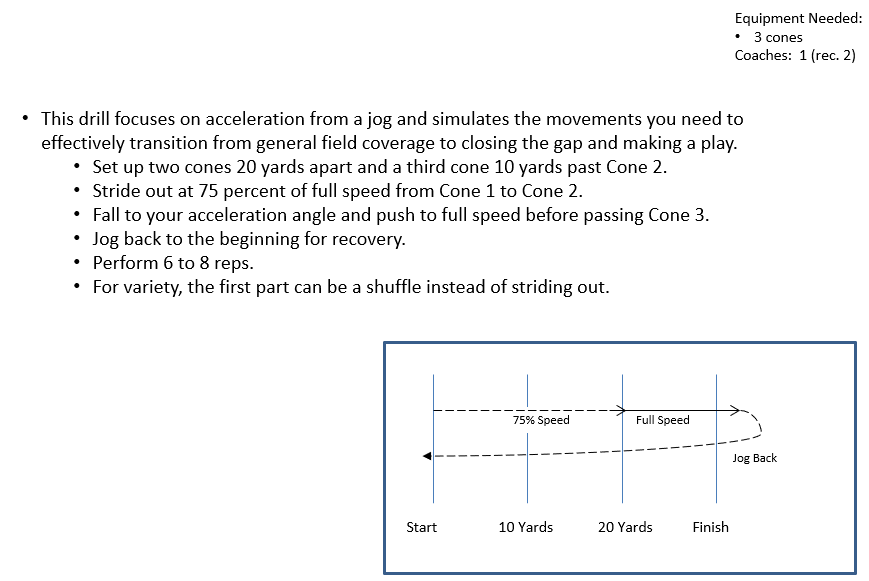 Flying Sprints Speed & Agility DrillsSprint Drills10-yard sprintsShuttle SprintShuttle Run DrillPush up StartBack Roll StartBreakdown Chop Fire20+ yard sprintsInterval SprintsSprint/Jog BackBack pedal into SprintsFlying SprintsSprint-Backpedal Repeats60-yard Shuttle RunSpeed Chute