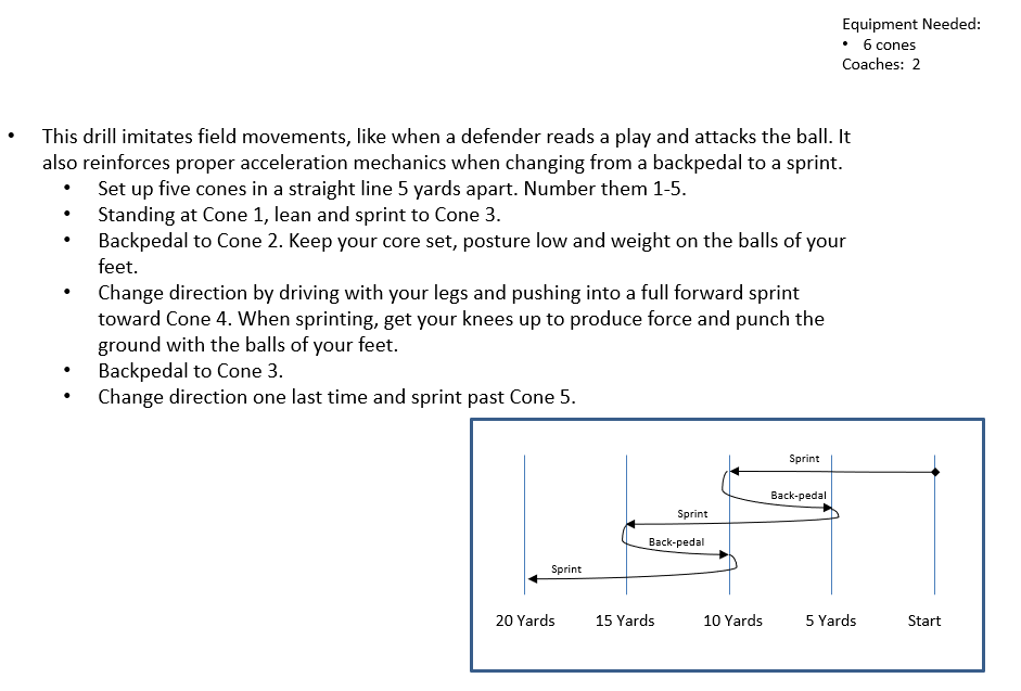 Sprint-Backpedal Repeats Speed & Agility DrillsSprint Drills10-yard sprintsShuttle SprintShuttle Run DrillPush up StartBack Roll StartBreakdown Chop Fire20+ yard sprintsInterval SprintsSprint/Jog BackBack pedal into SprintsFlying SprintsSprint-Backpedal Repeats60-yard Shuttle RunSpeed Chute