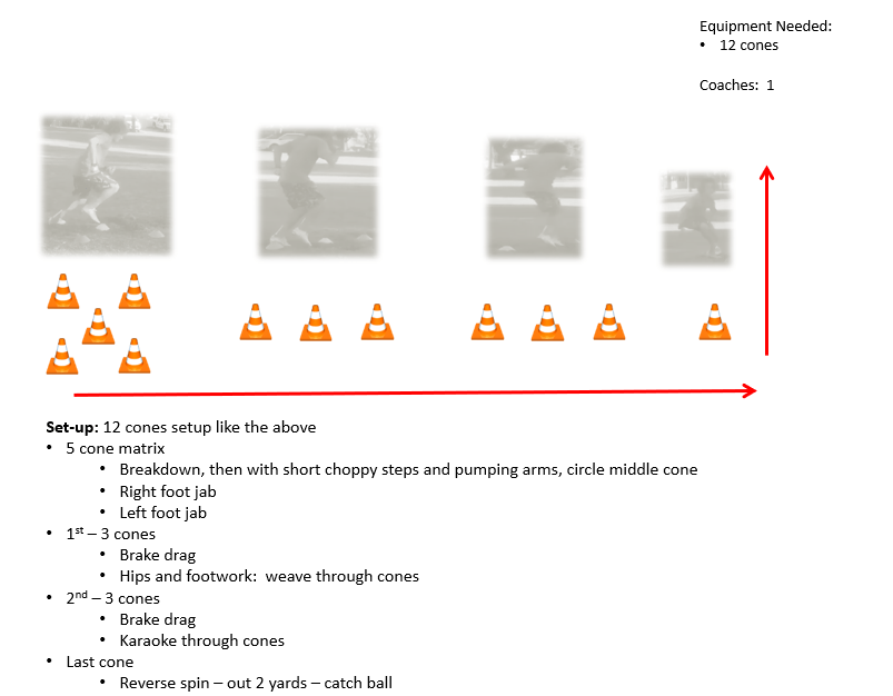Receiver Matrix Footwork YouTube Video – go to 1:49 Offense DrillsWide Receiver DrillsFundamentalsPass and Catch (stationary) DrillPassing Routes – WRCatch and Tuck DrillThrow at Shoulders DrillFootworkWide Receiver Figure 8 DrillLateral Agility and Route Quick Feet, Breakdown, & CatchReceiver Matrix FootworkFootwork Brake and ShakeAdvanced Footwork and RouteHesi (Hesitate) ShakeFootwork Obstacle CourseBasic ReceiverTip DrillClockwork DrillHide & SeekPush Up + Catch DrillPlayer Distraction DrillBag CatchStep Over Bag Drill & CatchBreakdown-Plant-DriveStay with the Receiver DrillWR Pass BlockingClose Contact CoverageSecondary ContactStalk DrillStalk Drill Progression