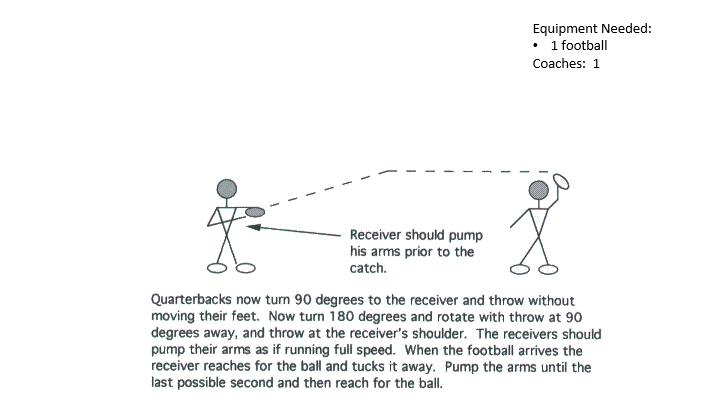 Throw at Shoulders Drill Offense DrillsWide Receiver DrillsFundamentalsPass and Catch (stationary) DrillPassing Routes – WRCatch and Tuck DrillThrow at Shoulders DrillFootworkWide Receiver Figure 8 DrillLateral Agility and Route Quick Feet, Breakdown, & CatchReceiver Matrix FootworkFootwork Brake and ShakeAdvanced Footwork and RouteHesi (Hesitate) ShakeFootwork Obstacle CourseBasic ReceiverTip DrillClockwork DrillHide & SeekPush Up + Catch DrillPlayer Distraction DrillBag CatchStep Over Bag Drill & CatchBreakdown-Plant-DriveStay with the Receiver DrillWR Pass BlockingClose Contact CoverageSecondary ContactStalk DrillStalk Drill Progression