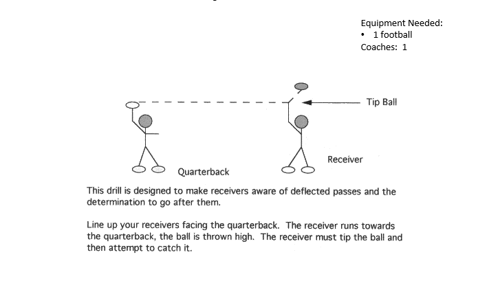 Tip Drill Offense DrillsWide Receiver DrillsFundamentalsPass and Catch (stationary) DrillPassing Routes – WRCatch and Tuck DrillThrow at Shoulders DrillFootworkWide Receiver Figure 8 DrillLateral Agility and Route Quick Feet, Breakdown, & CatchReceiver Matrix FootworkFootwork Brake and ShakeAdvanced Footwork and RouteHesi (Hesitate) ShakeFootwork Obstacle CourseBasic ReceiverTip DrillClockwork DrillHide & SeekPush Up + Catch DrillPlayer Distraction DrillBag CatchStep Over Bag Drill & CatchBreakdown-Plant-DriveStay with the Receiver DrillWR Pass BlockingClose Contact CoverageSecondary ContactStalk DrillStalk Drill Progression