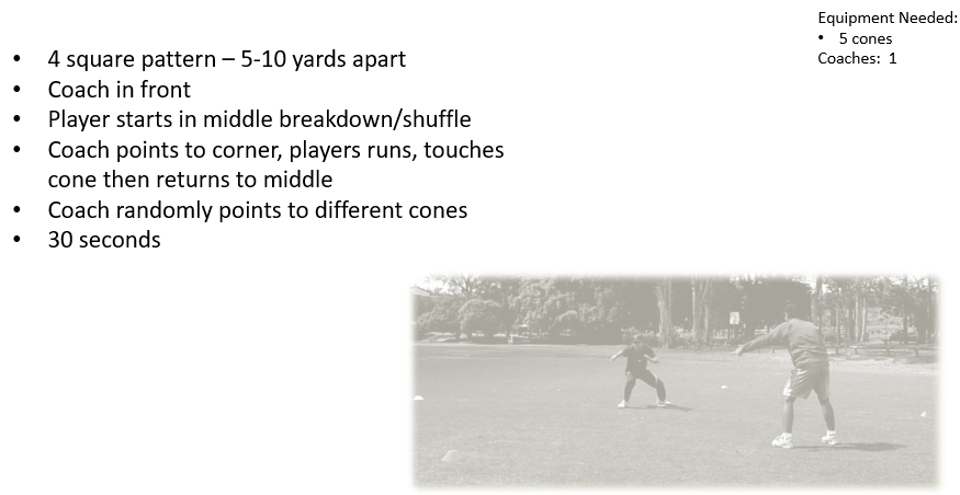 4 Corner Point n Go Speed & Agility DrillsCone Drills4 Cone4 Corner Point n Go4 Square Drill4 Cone DrillX Drill4 Cone D Drill5 Cone5 Corner CutStar Pattern5 Cone CrossBack-n-Forth3 Cone / L DrillWeave DrillSlalom DrillW Drill5-10-5 AgilityLinearCircle & Accelerate2 Feet in, 2 Feet Out