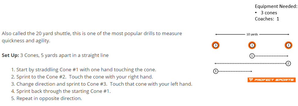 5-10-5 Agility Shuttle Drill Speed & Agility DrillsCone Drills4 Cone4 Corner Point n Go4 Square Drill4 Cone DrillX Drill4 Cone D Drill5 Cone5 Corner CutStar Pattern5 Cone CrossBack-n-Forth3 Cone / L DrillWeave DrillSlalom DrillW Drill5-10-5 AgilityLinearCircle & Accelerate2 Feet in, 2 Feet Out