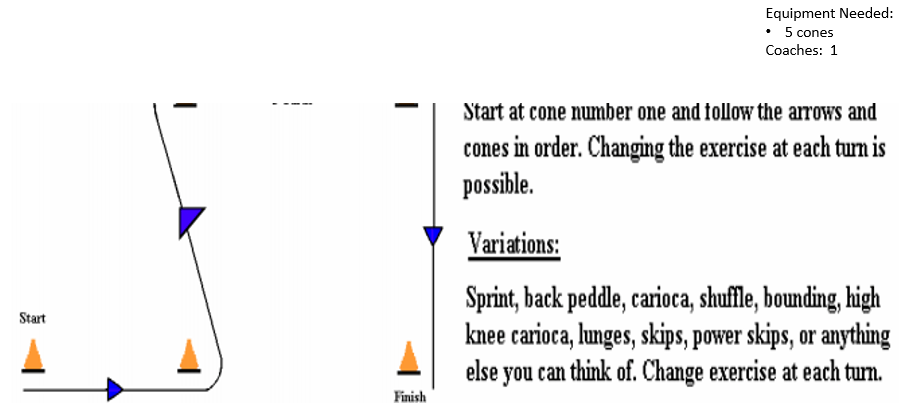 5 Cone Corner Cut Drill Speed & Agility DrillsCone Drills4 Cone4 Corner Point n Go4 Square Drill4 Cone DrillX Drill4 Cone D Drill5 Cone5 Corner CutStar Pattern5 Cone CrossBack-n-Forth3 Cone / L DrillWeave DrillSlalom DrillW Drill5-10-5 AgilityLinearCircle & Accelerate2 Feet in, 2 Feet Out
