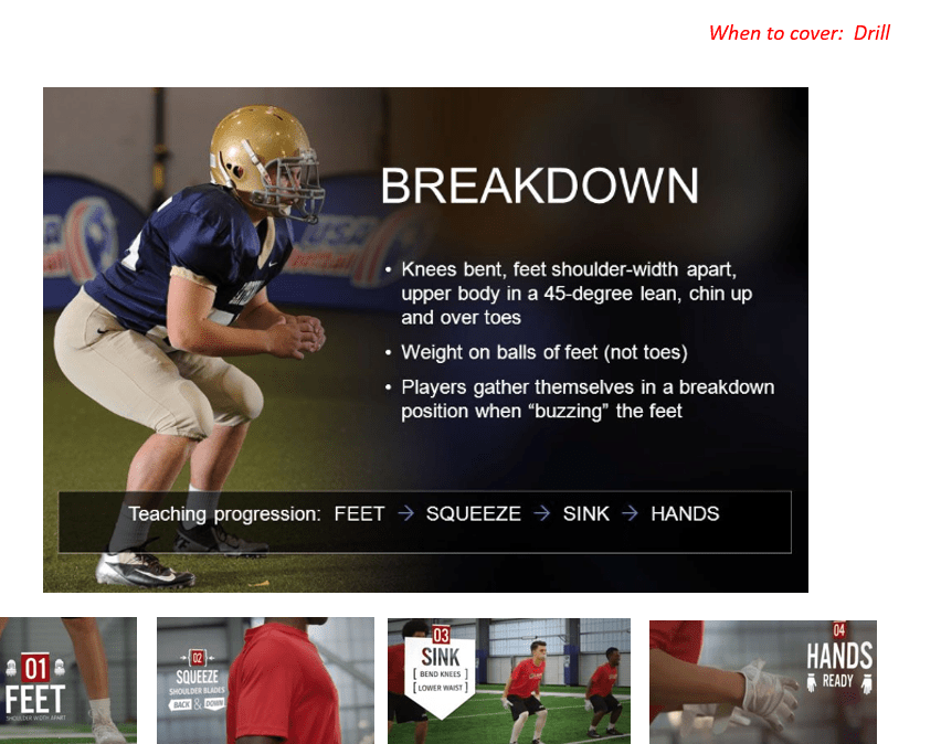 Breakdown Position Concepts & BasicsStance3 Point Stance4 Point StanceSnap CountCadenceBlockingBreakdown PositionChopping FeetTacklingHand offCatchingOffensive HolesPassing RoutesOffensive Positions / ResponsibilitiesDefensive Positions / ResponsibilitiesOffensive Huddle (2 tier)Offensive Line SplitsFootball Knee