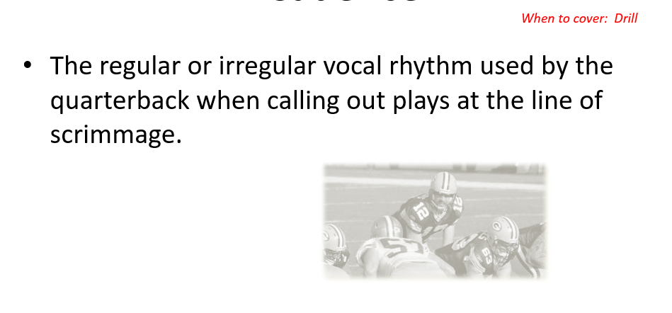 Cadence Concepts & BasicsStance3 Point Stance4 Point StanceSnap CountCadenceBlockingBreakdown PositionChopping FeetTacklingHand offCatchingOffensive HolesPassing RoutesOffensive Positions / ResponsibilitiesDefensive Positions / ResponsibilitiesOffensive Huddle (2 tier)Offensive Line SplitsFootball Knee