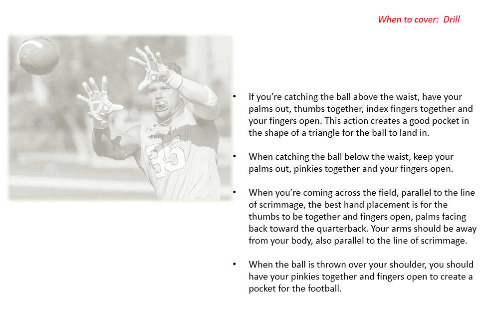 Catching Concepts & BasicsStance3 Point Stance4 Point StanceSnap CountCadenceBlockingBreakdown PositionChopping FeetTacklingHand offCatchingOffensive HolesPassing RoutesOffensive Positions / ResponsibilitiesDefensive Positions / ResponsibilitiesOffensive Huddle (2 tier)Offensive Line SplitsFootball Knee