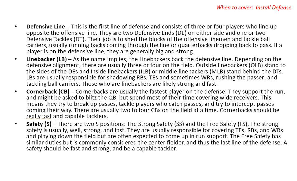 Defensive Positions / Responsibilities Concepts & BasicsStance3 Point Stance4 Point StanceSnap CountCadenceBlockingBreakdown PositionChopping FeetTacklingHand offCatchingOffensive HolesPassing RoutesOffensive Positions / ResponsibilitiesDefensive Positions / ResponsibilitiesOffensive Huddle (2 tier)Offensive Line SplitsFootball Knee