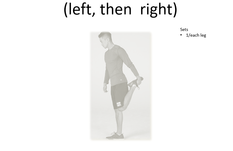 Standing Quad Stretch Warm upJoggingStretchJumping JacksArm CirclesStraight Leg/Touch ToeHamstring StretchLeg RaisesSit-upsQuad StretchSquatsInchwormsHit-its10 YardersWalking Knee HugsLungesSide ShufflesBack-PedalingKaraokeHigh KneesStance-fire-out